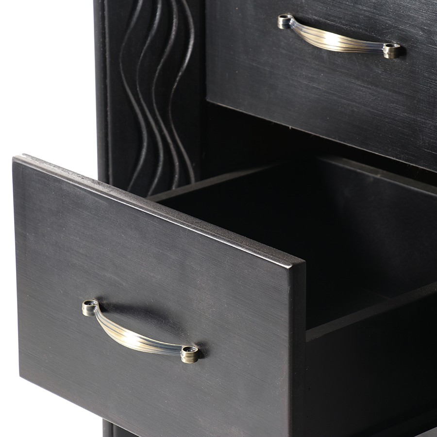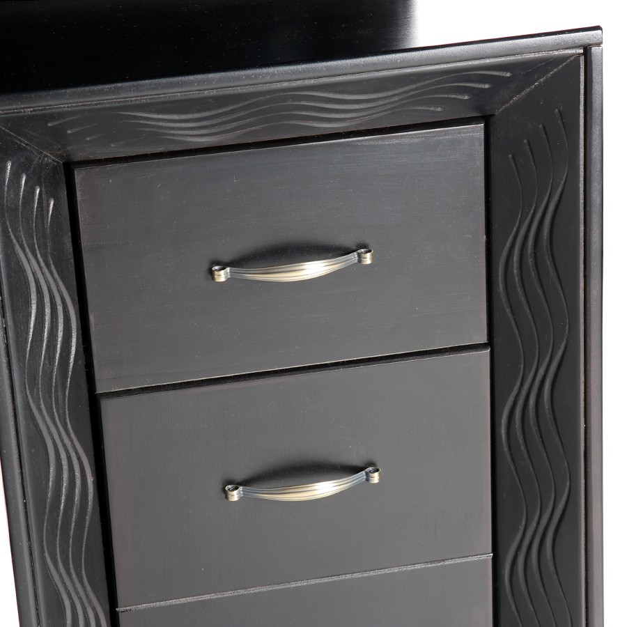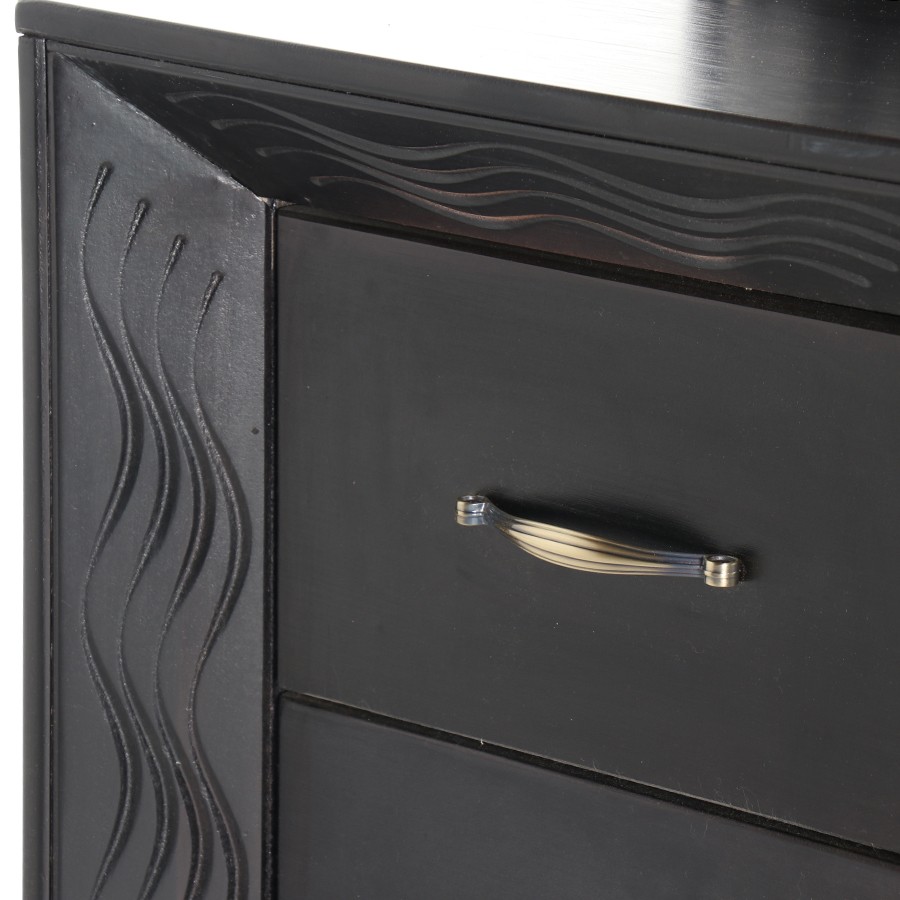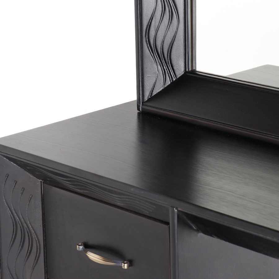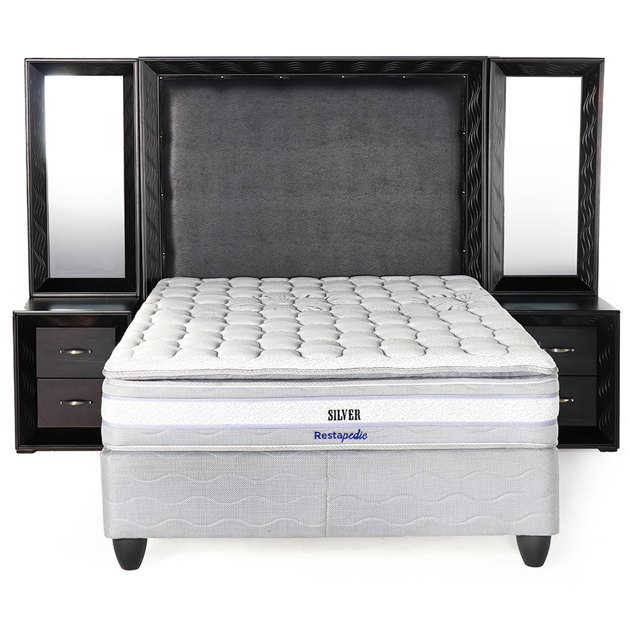 High and handsome headboard unit featuring side mirrors over the pedestal’s drawers.
