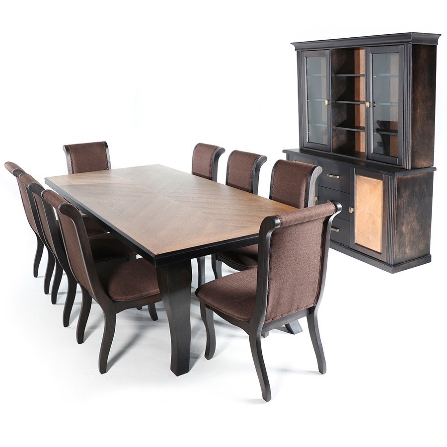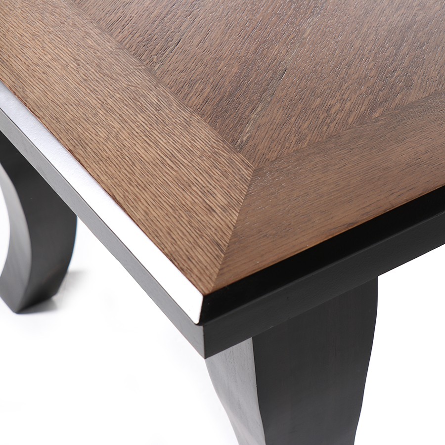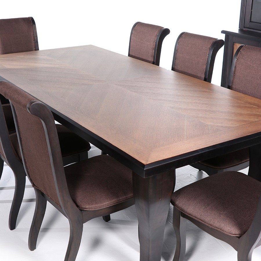 Made from the finest selected timber. The table is covered by a beautiful wood veneer. For comfort and support, the chairs’ padded seats and backrests are upholstered in fabric. Frequently clean with a dry, clean cloth. Use neither chemicals nor detergents.