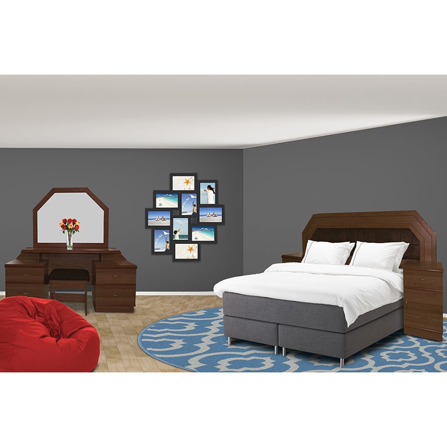 This 5-piece suite is called the Carmen. Elegant and reasonably priced. Queen- and King-size bed sets can fit there. A king-sized mattress fits in the suite without any problem. It has an unusual yet natural charm thanks to the foil coating.