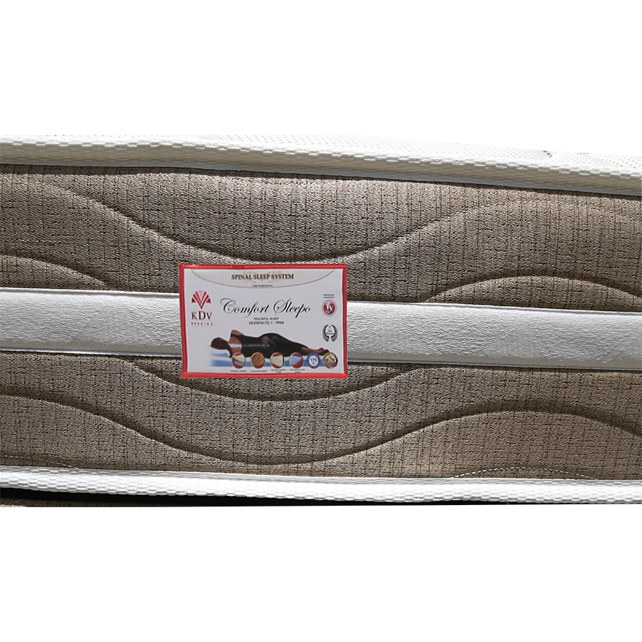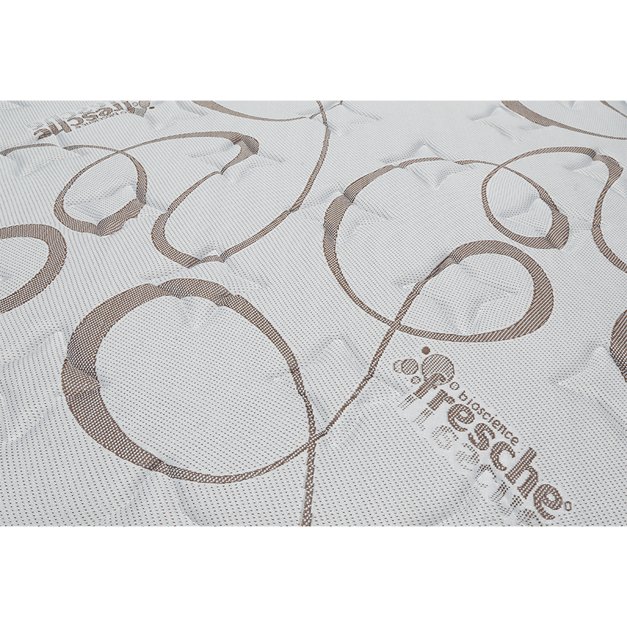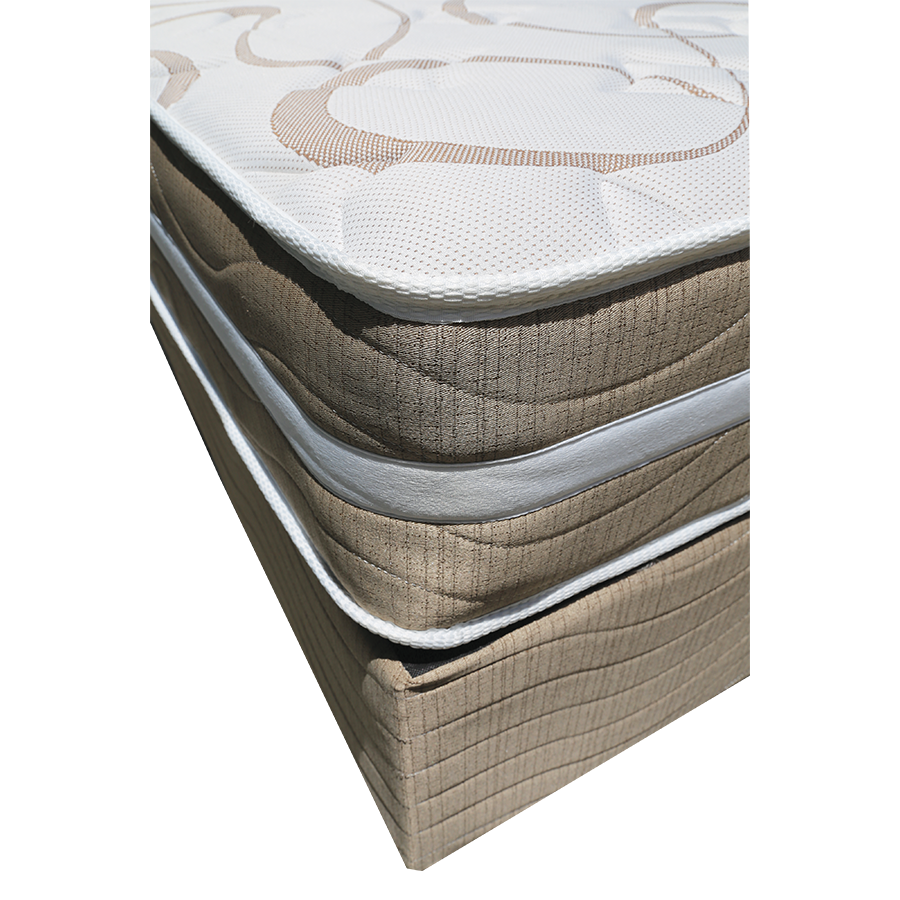 Moderately firm, middle-range bed set with no-turn mattress. Constructed around Bonnell spring technology with corner supports to prevent sagging Viracon is used to cover the spring unit and give added comfort and support. Recommended combined weight is 170kgs. The mattress sits on a solidly constructed base.