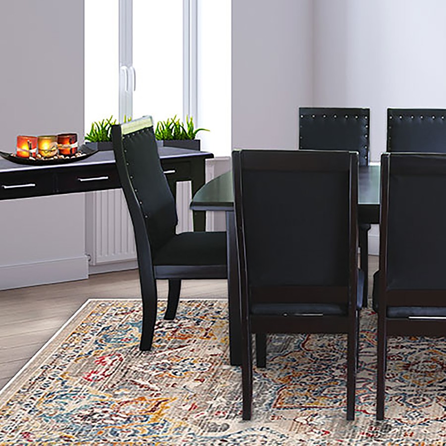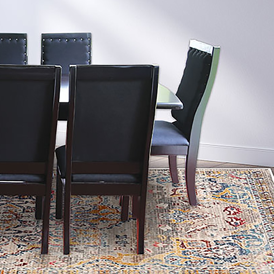 There are 8 chairs, a table, and a server in the 10PCE Gemini. Super wood is used to make the entire table and server. The frame of a chair is made of timber and foam. Also comes in a mahogany finish.