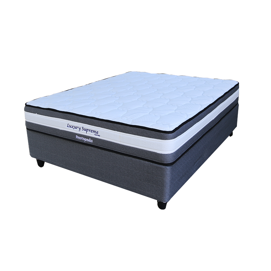 The Luxury Supreme plush-top double “never-turn” mattress with base. Bonnell springs for excellent spinal support. Multiple layers of high-density foam for comfort. Cotton-knit upholstery for warmth in winter and cool in summer.