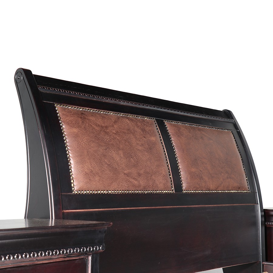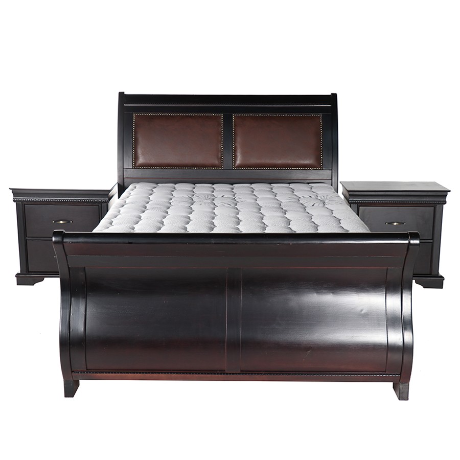 This classical sleigh bed makes the most fashionable bedroom. Beautiful, crafted side bed table curved feet board and super dressing chest.