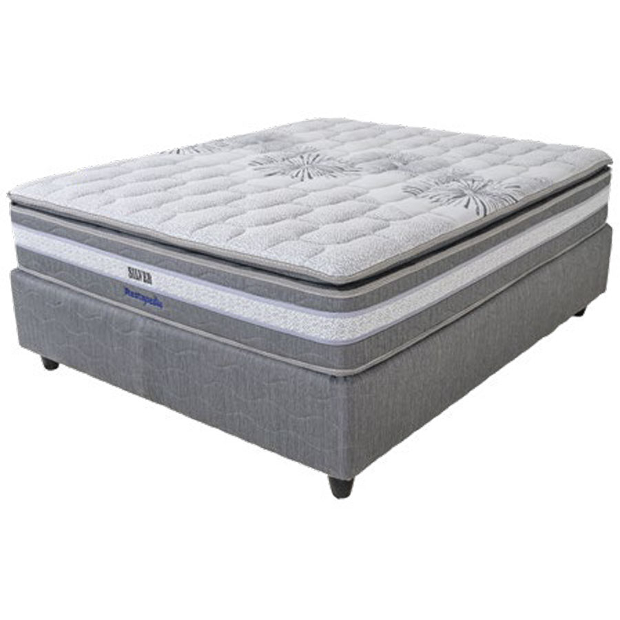 The Luxurious Restonic Silver Queen pillow-top mattress with stylish base and Bonnell springs for excellent spinal support. Pillow-top foam layer for extra comfort. 100% cotton knit upholstery for added warmth in winter and cool in summer.