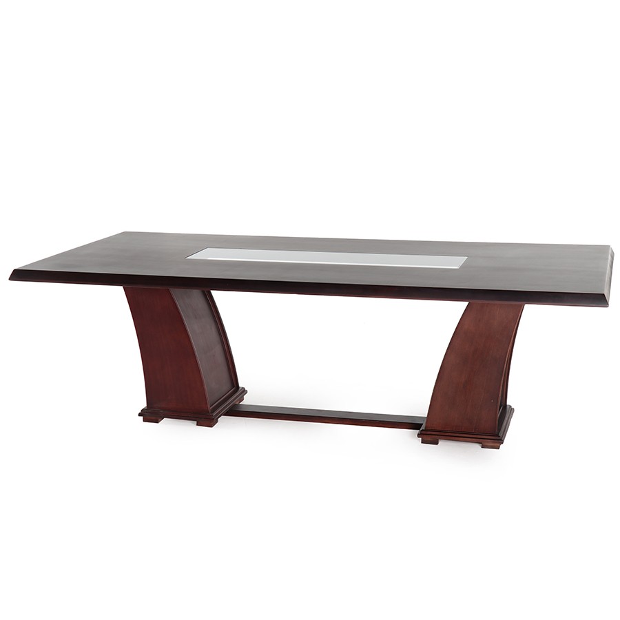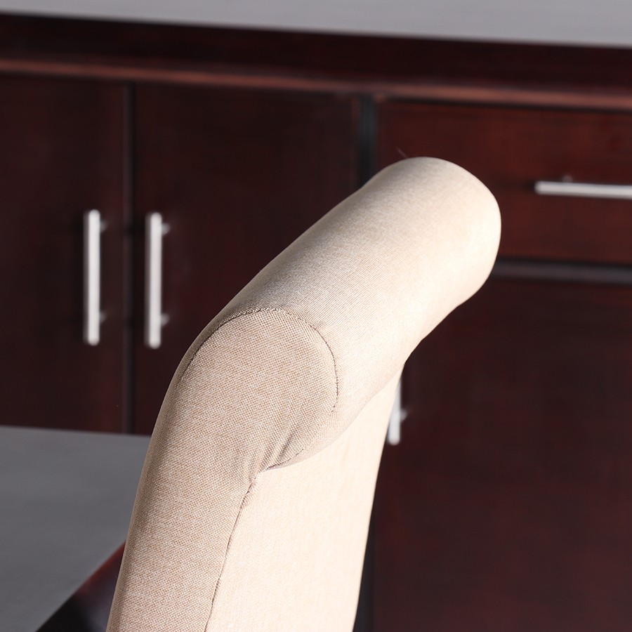 Made from the finest selected timber. The beautiful tabletop has a centred table leg. The chairs have a fabric upholstered padded seat and a high backrest adding a combination of comfort and support.