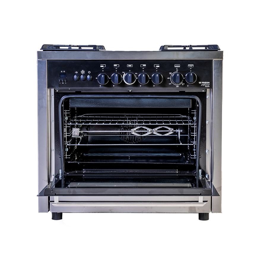 Stainless Steel cooker with 2 electric ceran plates, 4 gas burners and a 90 cm gas oven. Full ignition and flame safety device included.
